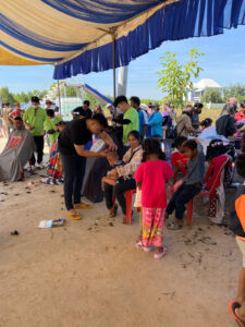 While serving in a different refugee camp yesterday, we witnessed something very moving. Cambodian Christian volunteers were providing haircuts, hair washing, and fingernail trimming under a tent. Hundreds of children and adults were waiting patiently in chairs for their turn. These volunteers were wearing blue shirts donated by a Korean church. On the shirts was a logo with the words “Healing Fields.” When I saw those words, my heart was deeply touched as I reflected on Cambodia’s journey—from the Killing Fields, to Healing Fields, and now, once again, battlefields.